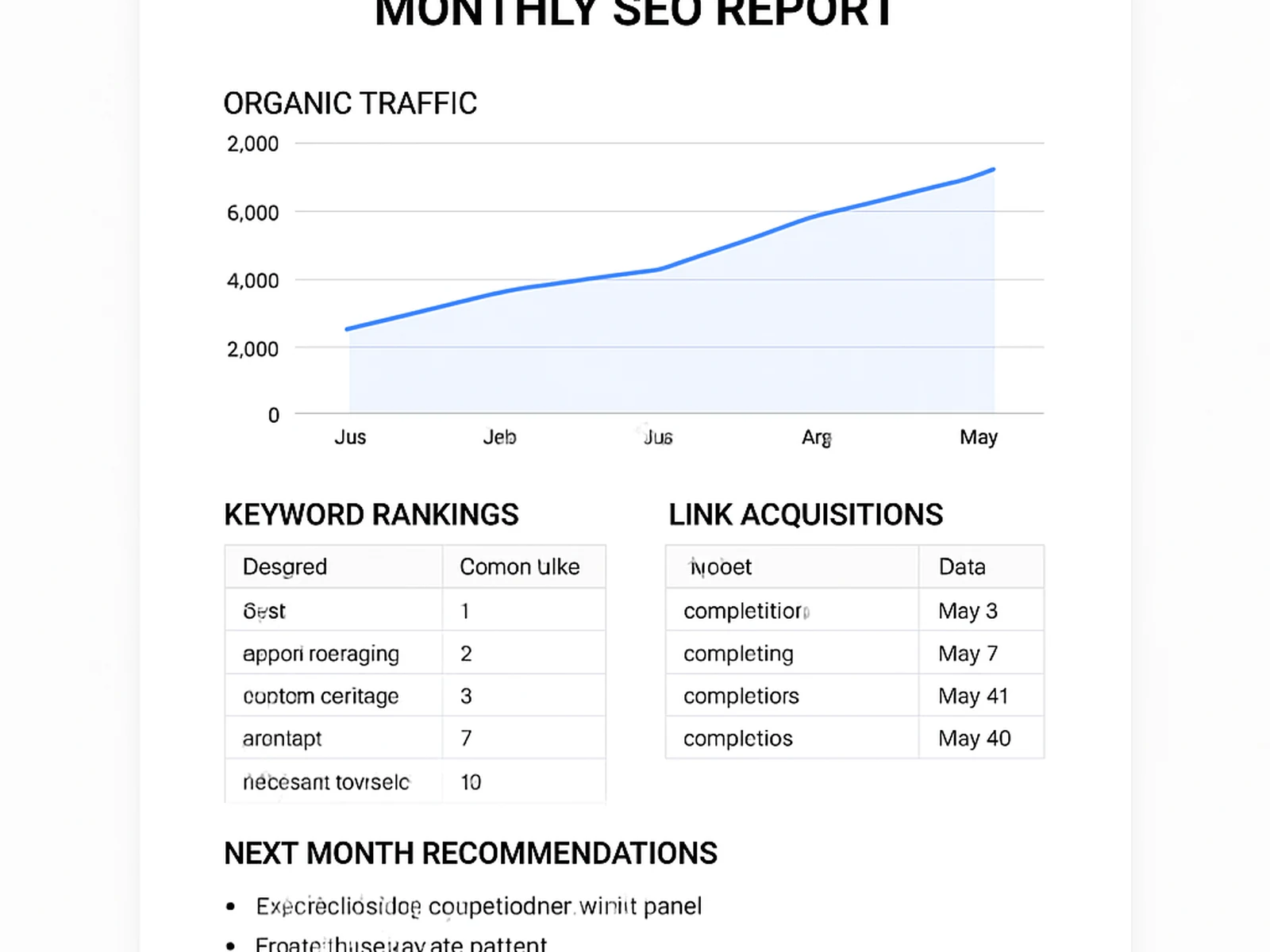 Monthly reports connect the SEO work directly to business outcomes: organic sessions, leads from organic, and revenue where tracking allows. We adjust strategy based on what the data shows, not based on a fixed plan that ignores results.